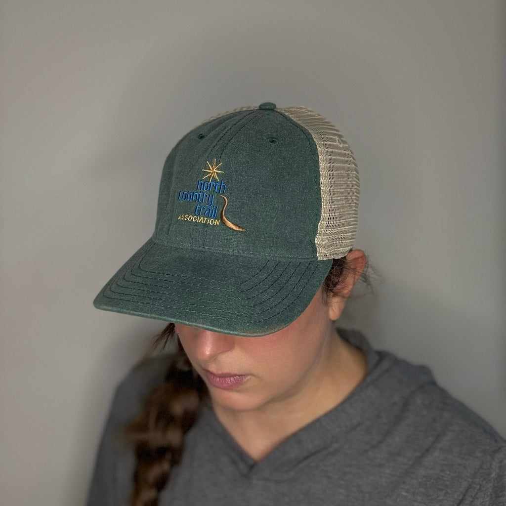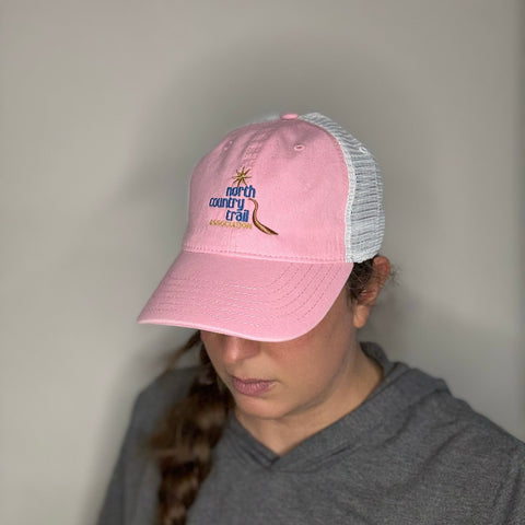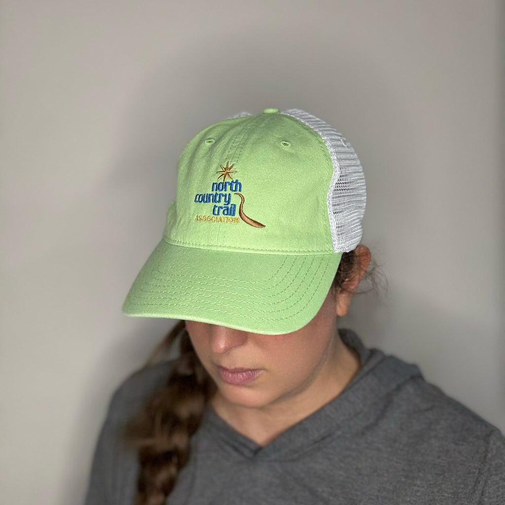 This unstructured soft front 6 panel Trucker hat features a relaxed fit, low-profile, garment-washed pigment-dyed 100% Cotton Twill, a curved visor, and a 100% Polyester mesh enclosed back design with "Otto Flex" sweatband. Embroidered "NCTA" logo on the front. The moisture wicking, antibacterial stretchable sweatband is available in 2 sizes: S/M (fits sizes 7 - 7 1/4) and L/XL (fits sizes 7 3/8 - 7 5/8). Crown Height - 3.2" - 3.3". See sizing guide in photos. Colors available: Navy/Khaki, Dark Green/Khaki, Pink/White, and Lime/White. Brand: Otto.